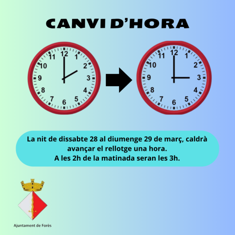 La nit de dissabte 28 al diumenge 29 de març hi haurà el canvi a l'horari d'estiu. Les 2h de la matinada passaran a ser les 3h.