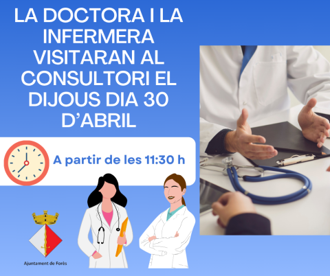 Des del CAP de Montblanc, ens han comunicat que està previst que la doctora i la infermera visitin al consultori mèdic de Forès el pròxim dijous dia 30 d'abril, a partir de les 11:30h. S'atendrà als usuaris per ordre d'arribada.
