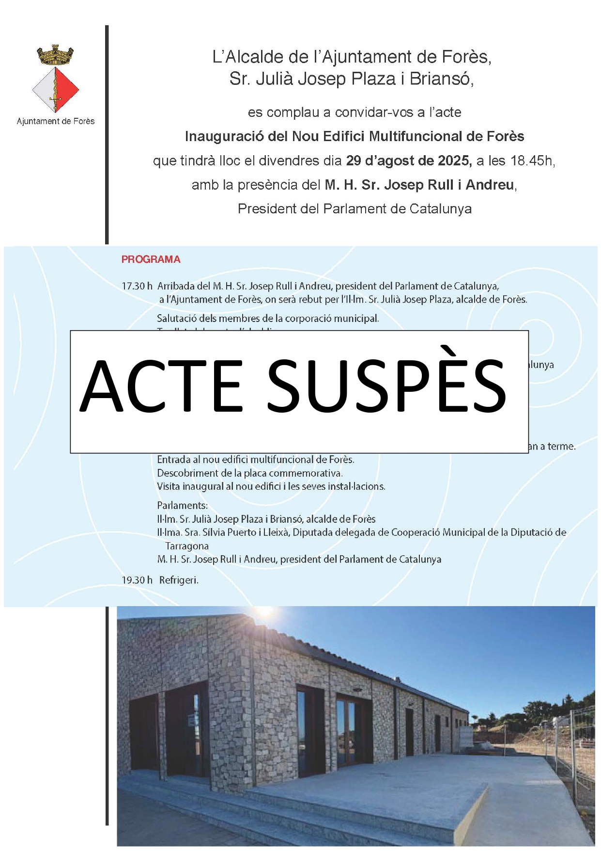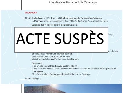 Us informem que l’acte d’inauguració del nou edifici multifuncional de Forès programat per avui divendres 29 d'agost se suspèn per motius de força major.
