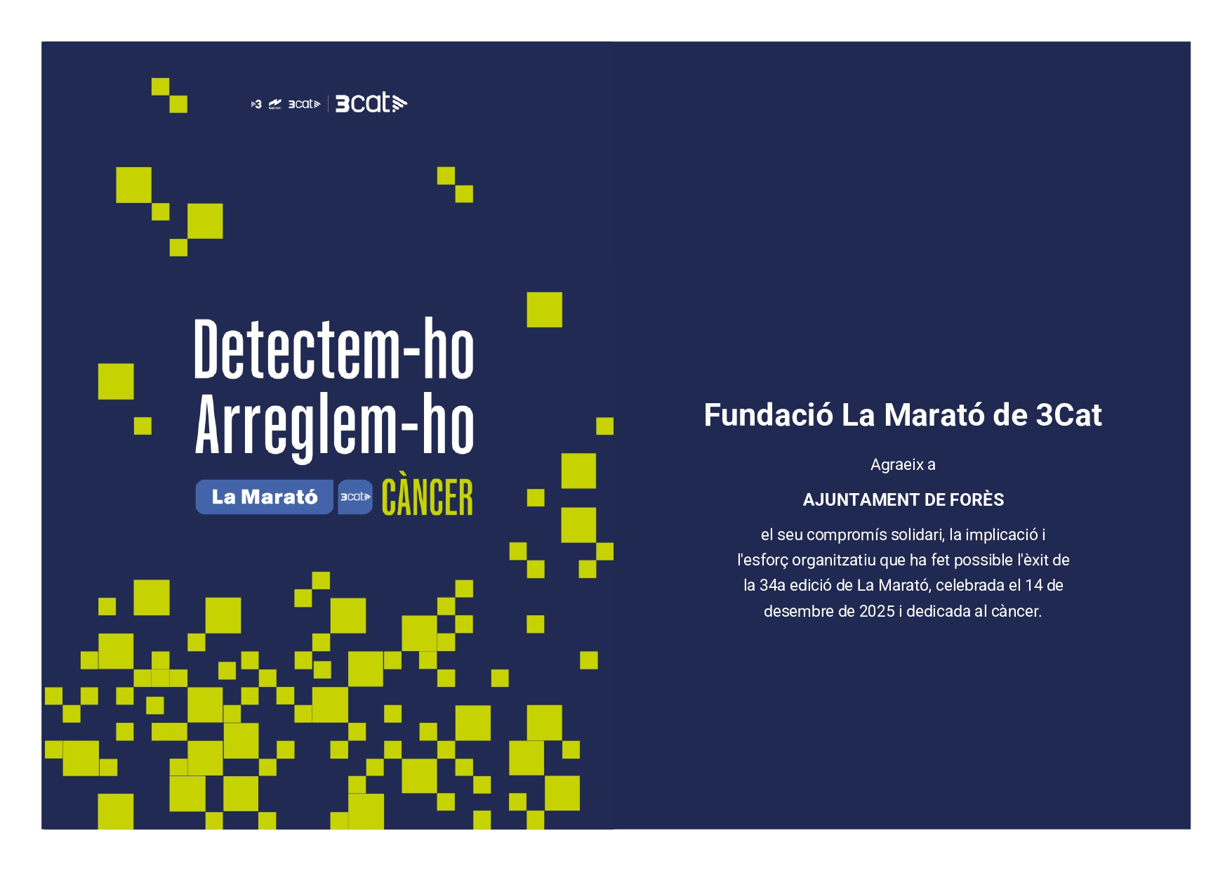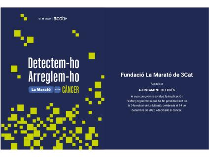 Des de l'Ajuntament de Forès us informem que amb motiu de la celebració del bingo solidari organitzat el passat diumenge 7 de desembre s’ha aconseguit recaptar un total de 325 € que seran destinats íntegrament a La Marató de TV3 2025, enguany dedicada a la investigació i la lluita contra el càncer.