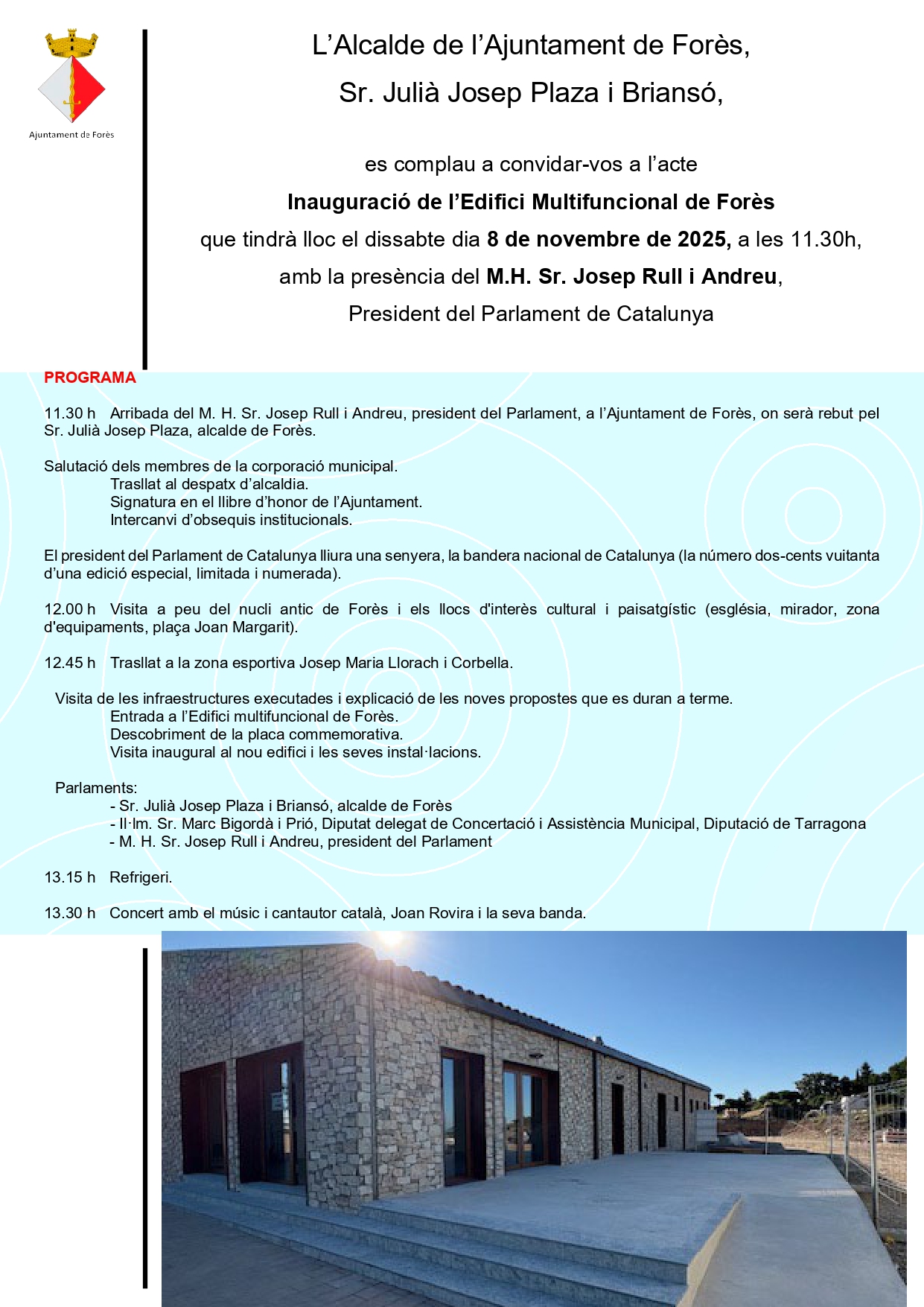 L’Ajuntament de Forès té el plaer de convidar-vos a l’acte d’inauguració del nou Edifici Multifuncional de Forès, que tindrà lloc el proper dissabte 8 de novembre de 2025 amb la presència del M. H. Sr. Josep Rull i Andreu, president del Parlament de Catalunya.