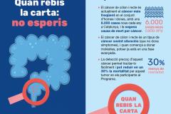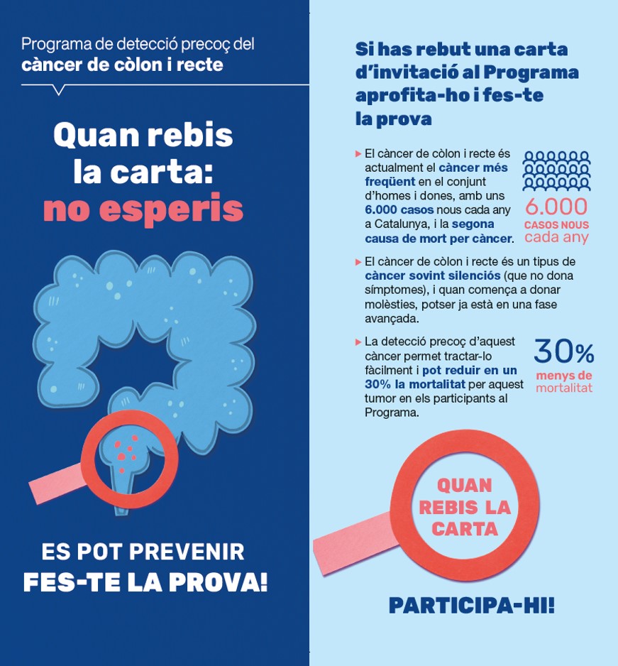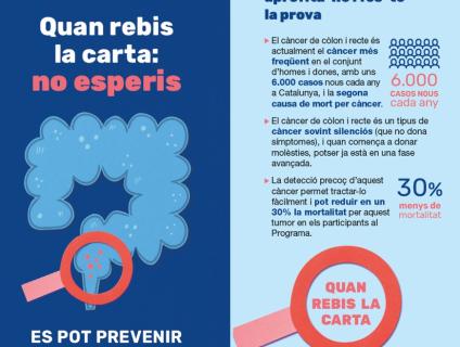 El Programa de Detecció Precoç de Càncer de Còlon i Recte s’adreça a tots els homes i dones d’entre 50 i 69 anys i consisteix a fer-se, cada dos anys, una senzilla prova a casa per detectar si les deposicions contenen petites quantitats de sang no visibles. Durant els propers mesos, convidarem a la població d’aquesta zona que tingui entre 50 i 69 anys, els quals rebran una carta del Programa a casa amb les instruccions que han de seguir.
